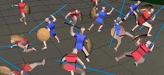For the close combat scenes I devised a system which enables the use of pre-choreographed multi-character animation clips within a crowd simulation. It was used to insert many high quality 1-on-1 fights performed my stunt actors into the melee - which helped a lot in making the action more believable.