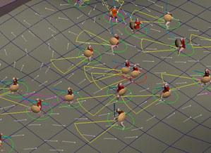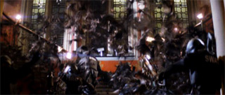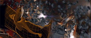 Batman Begins was the chance for me to add another dimension to crowd simulation - the third one. ALICE had so far only been used to produce simulation running in 2d, but for the swarms of bats this was clearly not sufficient. After creating a suitable simulation bat rig in conjunction with the Rigging TD I extended the crowd system to support full 3d movement of agents. In addition I build a Maya dependecy graph rule network which would emulate the flight behaviour of bats.