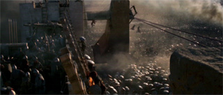 I added multiple digital stunt double falling and jumping out of collapsing siege towers, crashing into the ground or onto other soldiers - they were realise using PAPI. This is a proprietary physics tool in Maya which allows the seamless blending of motion capture data and ragdoll dynamics.